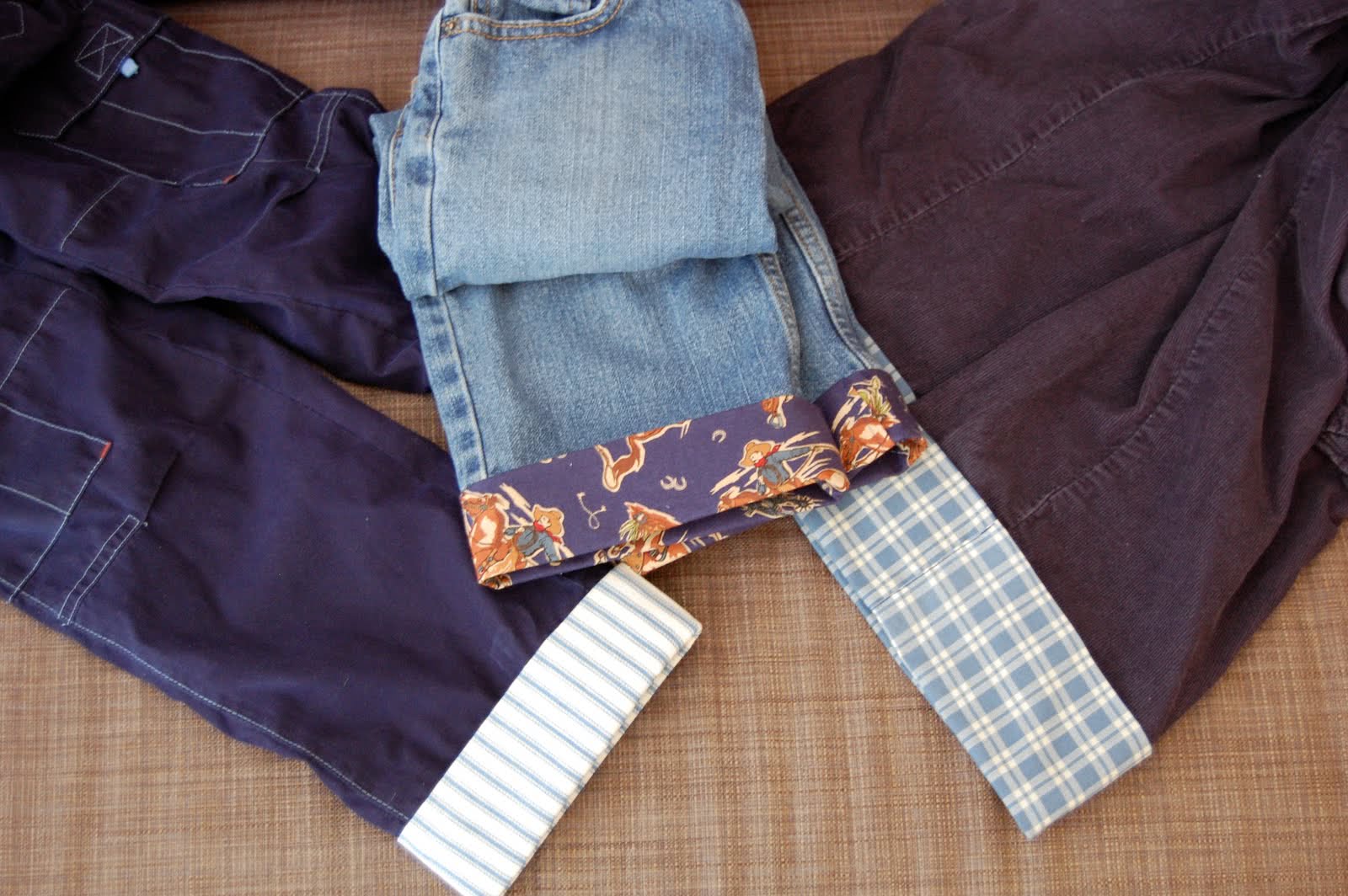 Для того чтобы удлинить штаны дома необязательно иметь такой же материал. Хорошо подойдут и другие ткани, например: цветные лоскуты, кружево или тесьма для брюк, а также трикотажные манжеты для спортивных штанов.