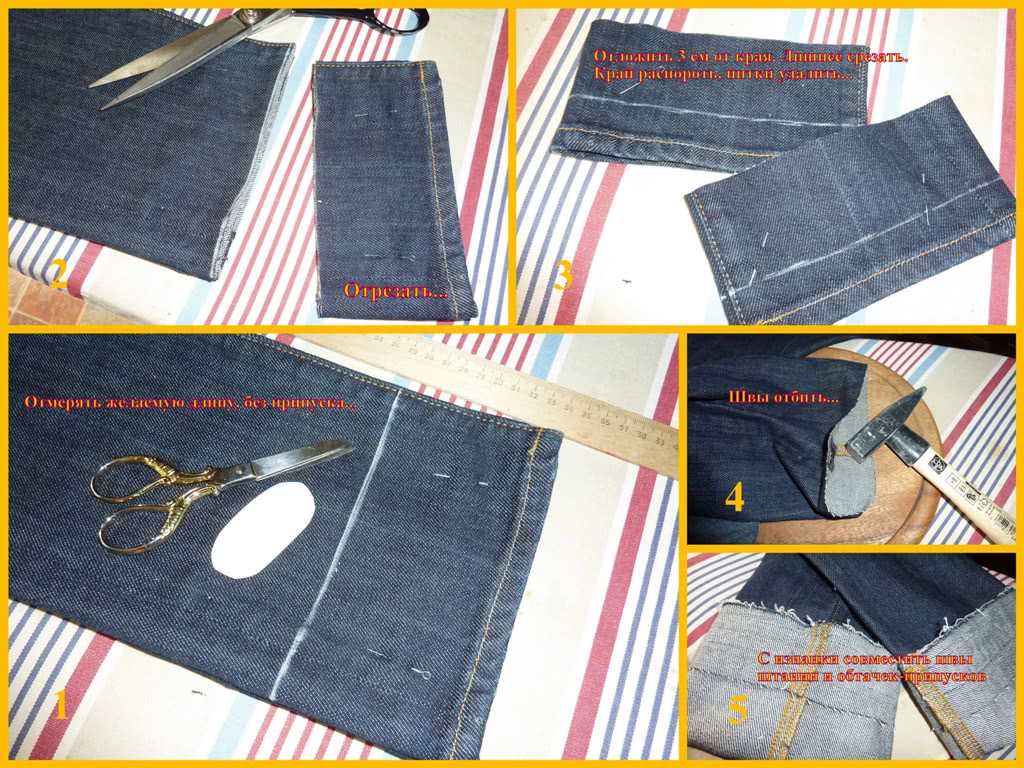 Отрезать часть брючины, сделать вставку из другого материала.. Иногда вещь садится после стирки. Тогда нужно действовать по такому алгоритму: