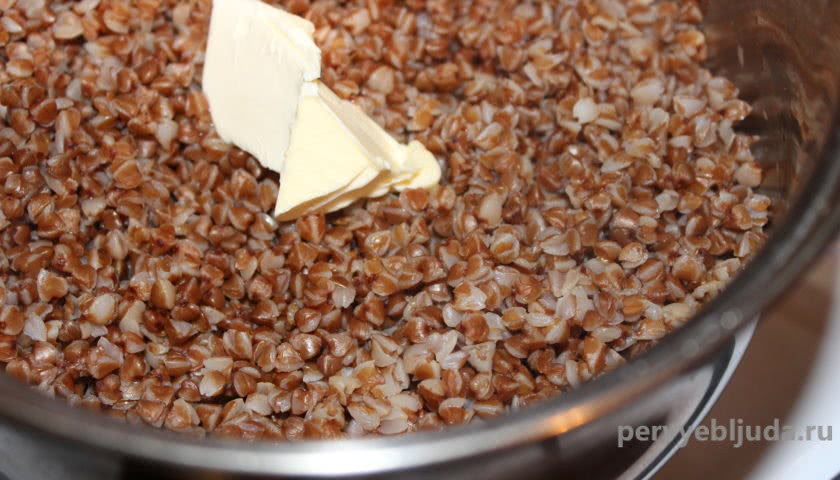 - По окончанию варки (когда гречка будет готова и вода выкипит), снимаем кастрюлю с плиты, добавляем сливочное масло и укутываем кастрюлю в полотенце, после чего оставляем на 10-15 минут, чтобы каша настоялась.