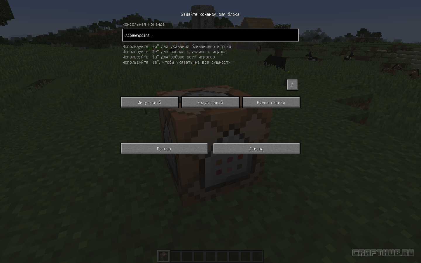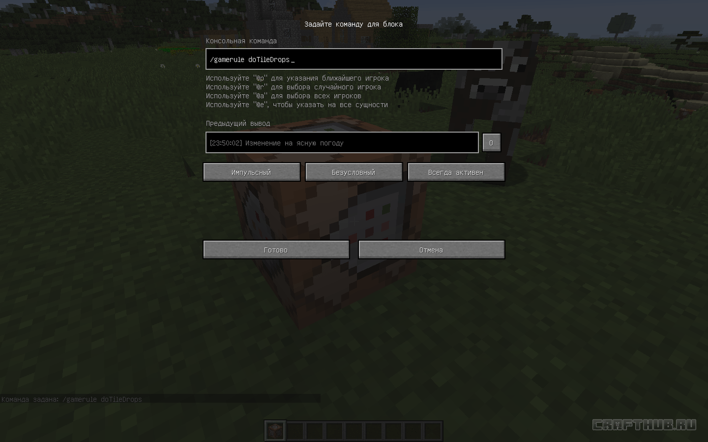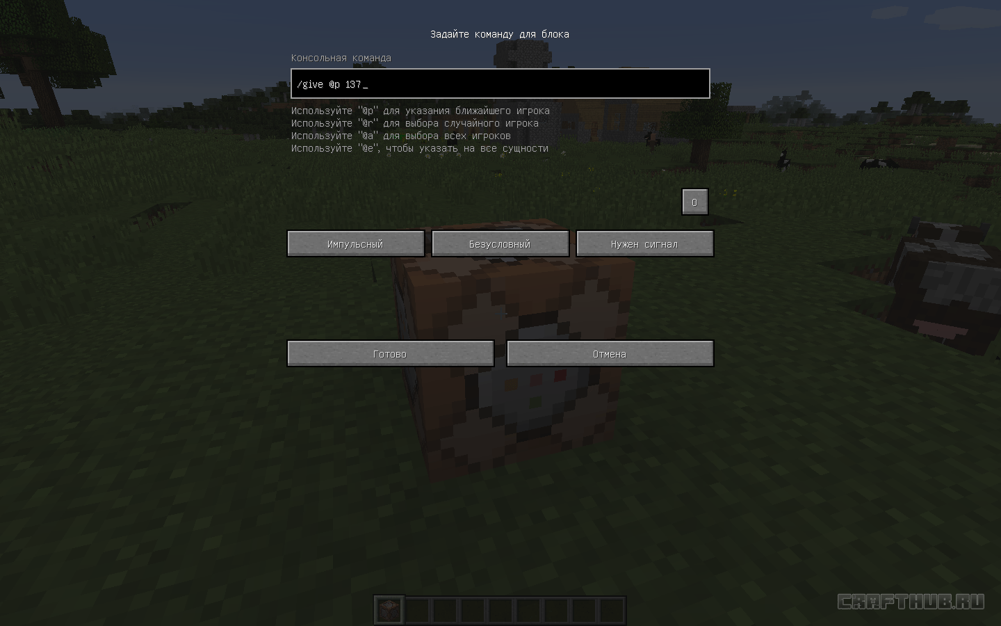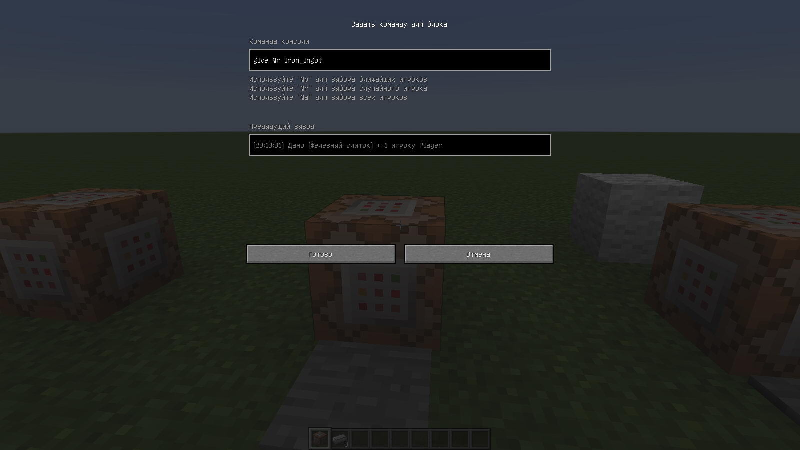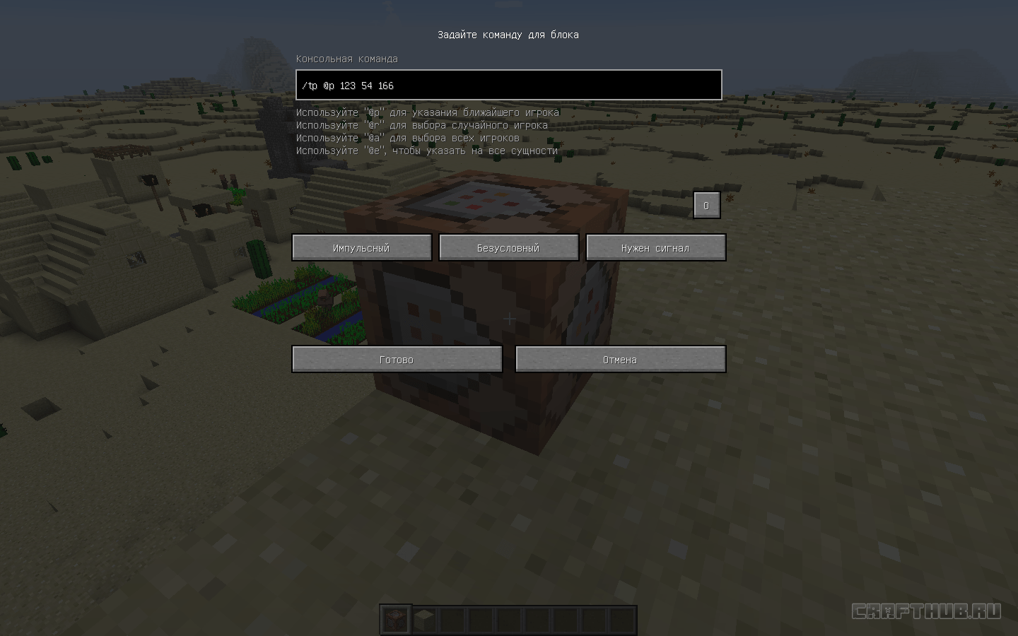 Когда вы вводите команду в блок, нужно указать, на какого игрока она направлена. Это можно сделать вводом имени игрока или выбором трёх разных переменных: «@p» (ближайший игрок), «@r» (случайный игрок) или «@a» (все игроки). Эти переменные особенно полезны в ситуациях, когда неизвестен игрок, активирующий команду. Задав команду, нажмите «Готово» для её сохранения.