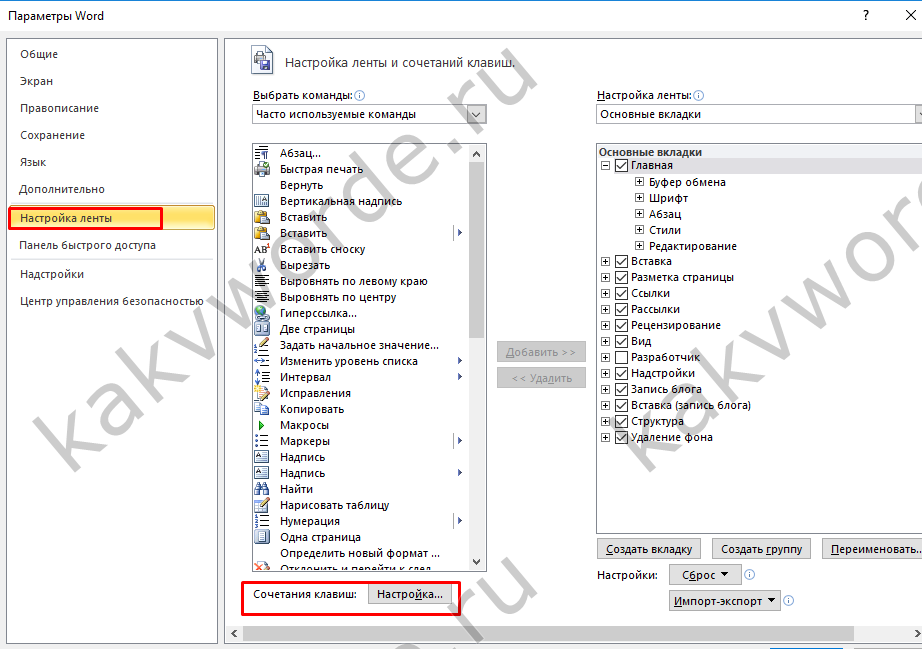 Откройте вкладку «Файл» – «Параметры» – «Настройка ленты». Возле «Сочетания клавиш» нажмите на «Настройка».