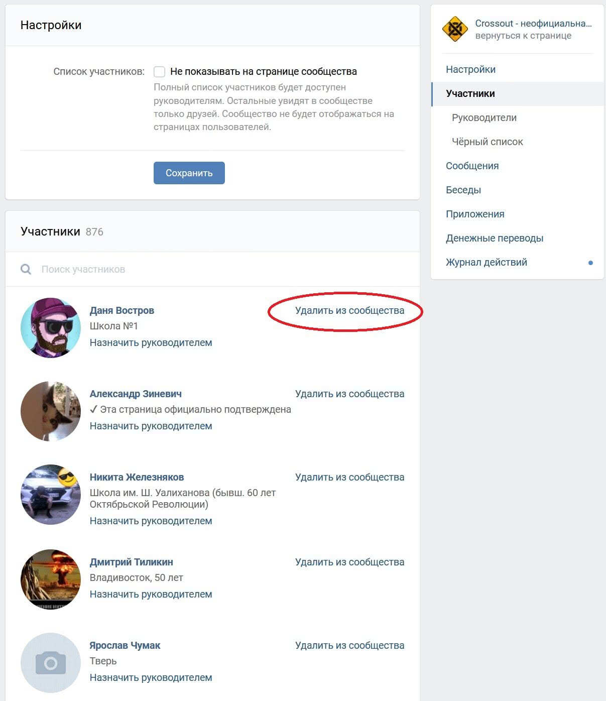 - Теперь переходим к участникам. Как удалить всех участников группы вк: сделать это можно только вручную. Если у вас тысячи фолловеров, то это может занять не один час. Вам потребуется зайти во вкладку “Управление сообществом” и самостоятельно нажать на кнопку «Удалить из сообщества».