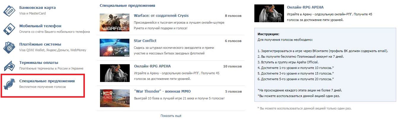 Получить голоса бесплатно довольно просто. Думаю, на скрипншоте выше, вы заметили раздел «Специальные предложения». Именно туда и необходимо перейти. Там будет много различных рекламных акций и компаний, за выполнение которых можно получить желаемые голоса.