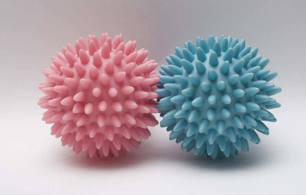 В качестве хорошей альтернативы теннисным мячикам выступают специальные пластиковые шарики. Они имеют тот же размер, однако полые внутри и более лёгкие. Многие оснащены ощутимым рельефом – шипами и пупырышками. Это делает их ещё более эффективными – благодаря неровной поверхности, они лучше взбивают наполнитель и очищают материал.