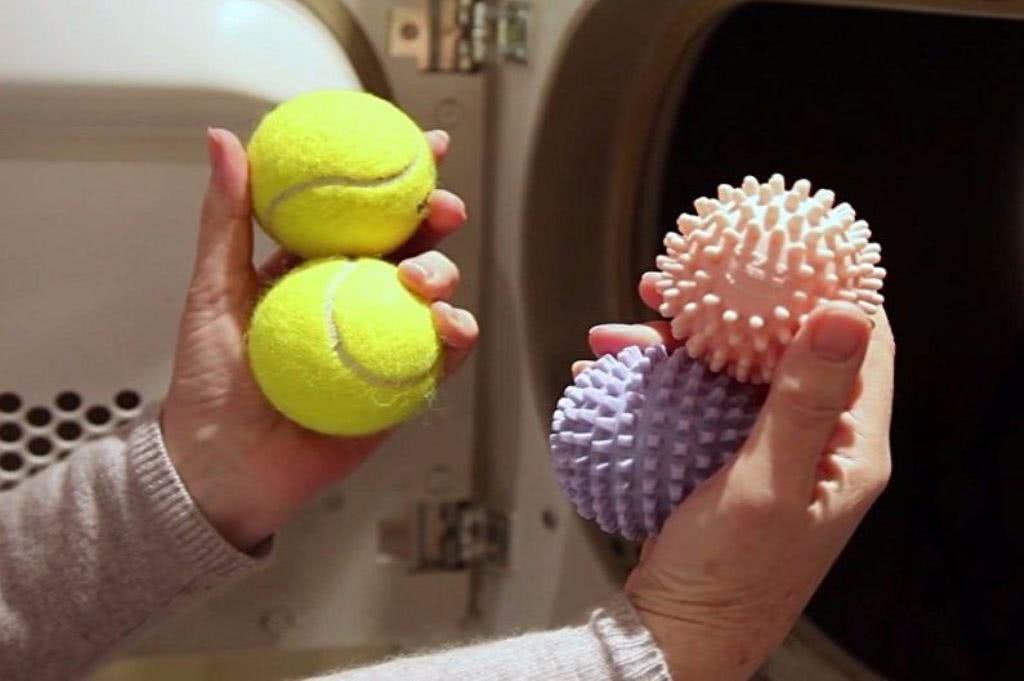 Чтобы не испортить вещь, хозяйки прибегают к стирке пуховика в машине с теннисными мячиками. От интенсивного вращения барабана во время стирки, полоскания и сушки, мячики свободно перемещаются внутри, отскакивают от стенок и ударяются в стирающиеся вещи. Благодаря этому они выполняют сразу несколько полезных функций: