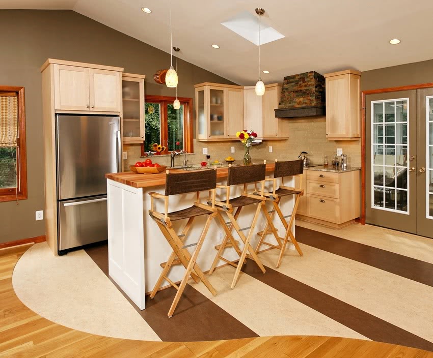 Когда дело доходит до эстетики, то линолеум может вписаться в любой интерьер. С «паркетным» или «каменным» дизайном он идеально подходят для кухонь в классическом стиле. Настил станет гармоничным фоном для деревянной мебели и приглушенных цветов. Любители классики могут сделать ставку на плитку, а те, кто любит сходить с ума, декорируя интерьер, выбирают красочный линолеум в фанатичном стиле.