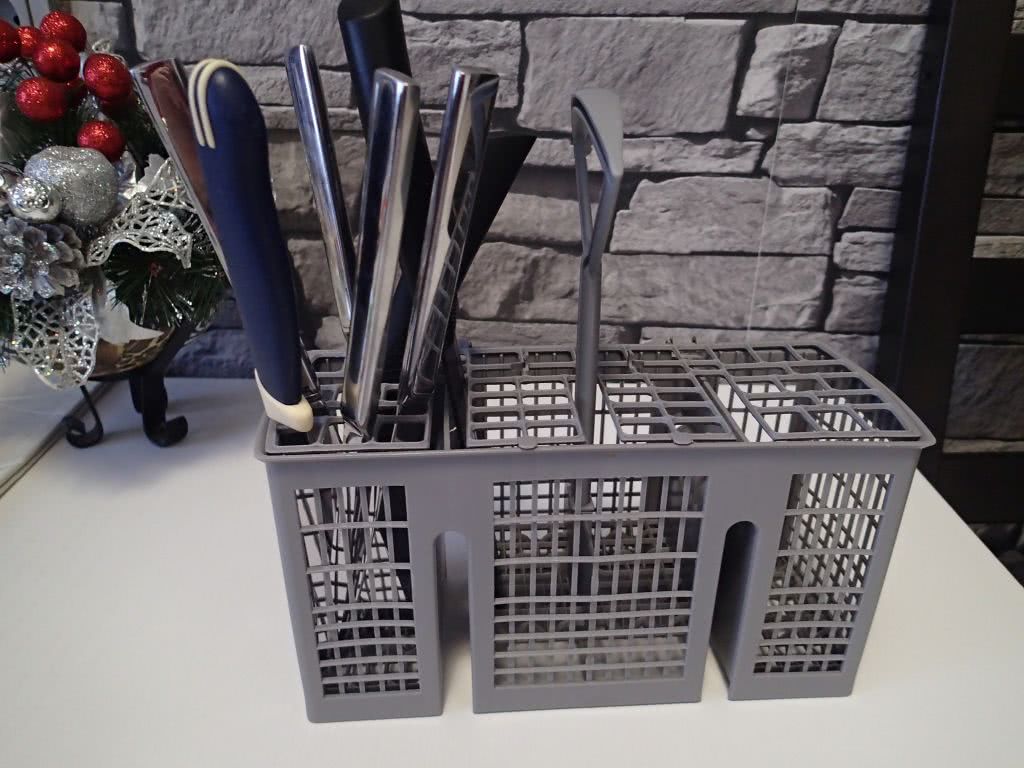 - Лоток или отдельная корзина для столовых приборов. Ложки, ножи и вилки аккуратно расставляют или раскладывают по отсекам, не допуская нагромождения.