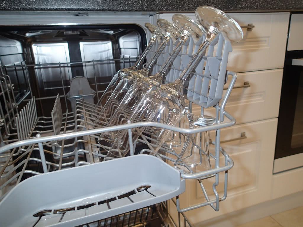 Невысокие тонкие фужеры и винные бокалы удобнее мыть в специальном держателе. Этот аксессуар вмещает в зависимости от модели 4 или 8 фужеров, но стоит недешево и приобретается отдельно.