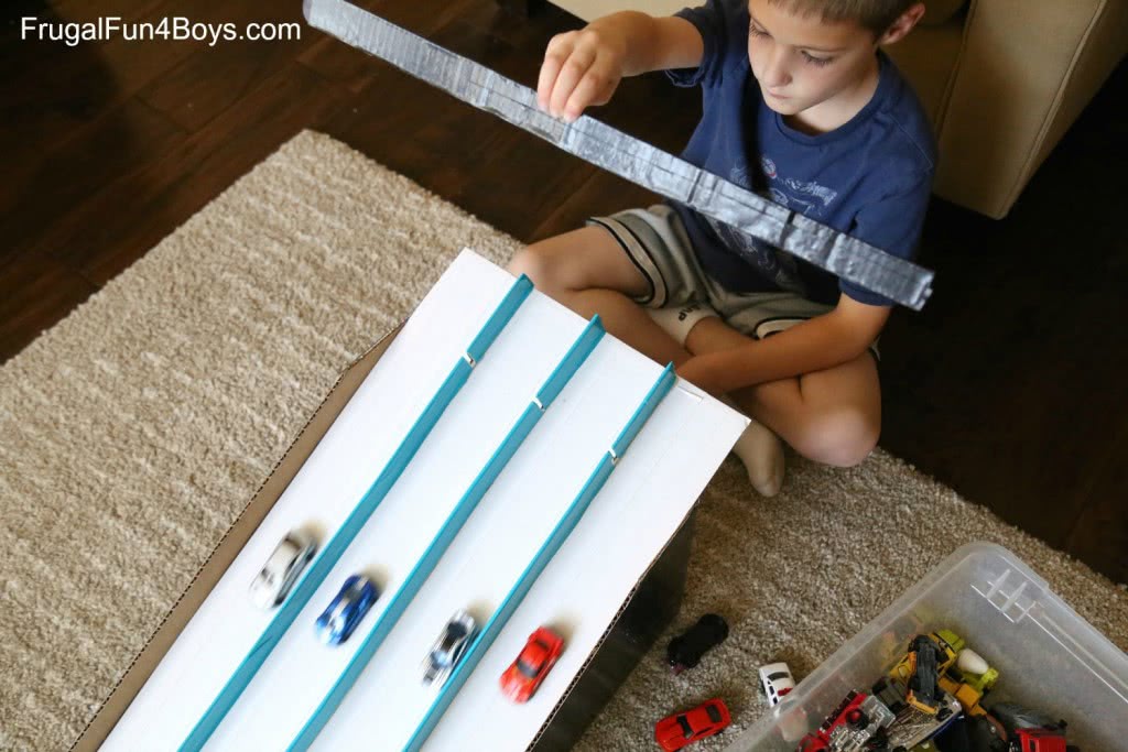 На наклонной плоскости машинки стартуют вместе, но к финишу придут не одновременно. Победителем станет самый технически продвинутый автомобиль! Сделать такую игру с машинками своими руками проще простого: нужен лишь картонный коробок и немного пространственного мышления.