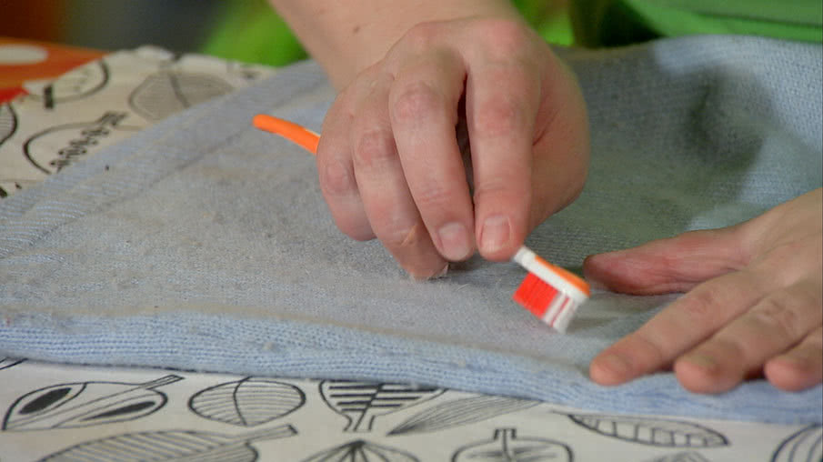 4. Шерстяные ткани из ангоры или мохера можно попробовать расчесать зубной щёткой, направляйте её вдоль волокон. Затем постирайте изделие, прополощите с добавлением уксуса и высушите на свежем воздухе.