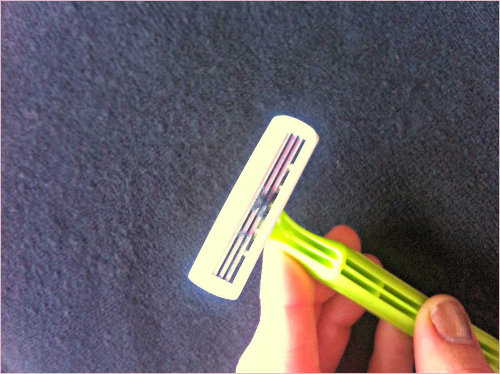 Идеально подойдёт одноразовый станок без полоски мыла. Он достаточно острый, не испортит одежду этой полоской.