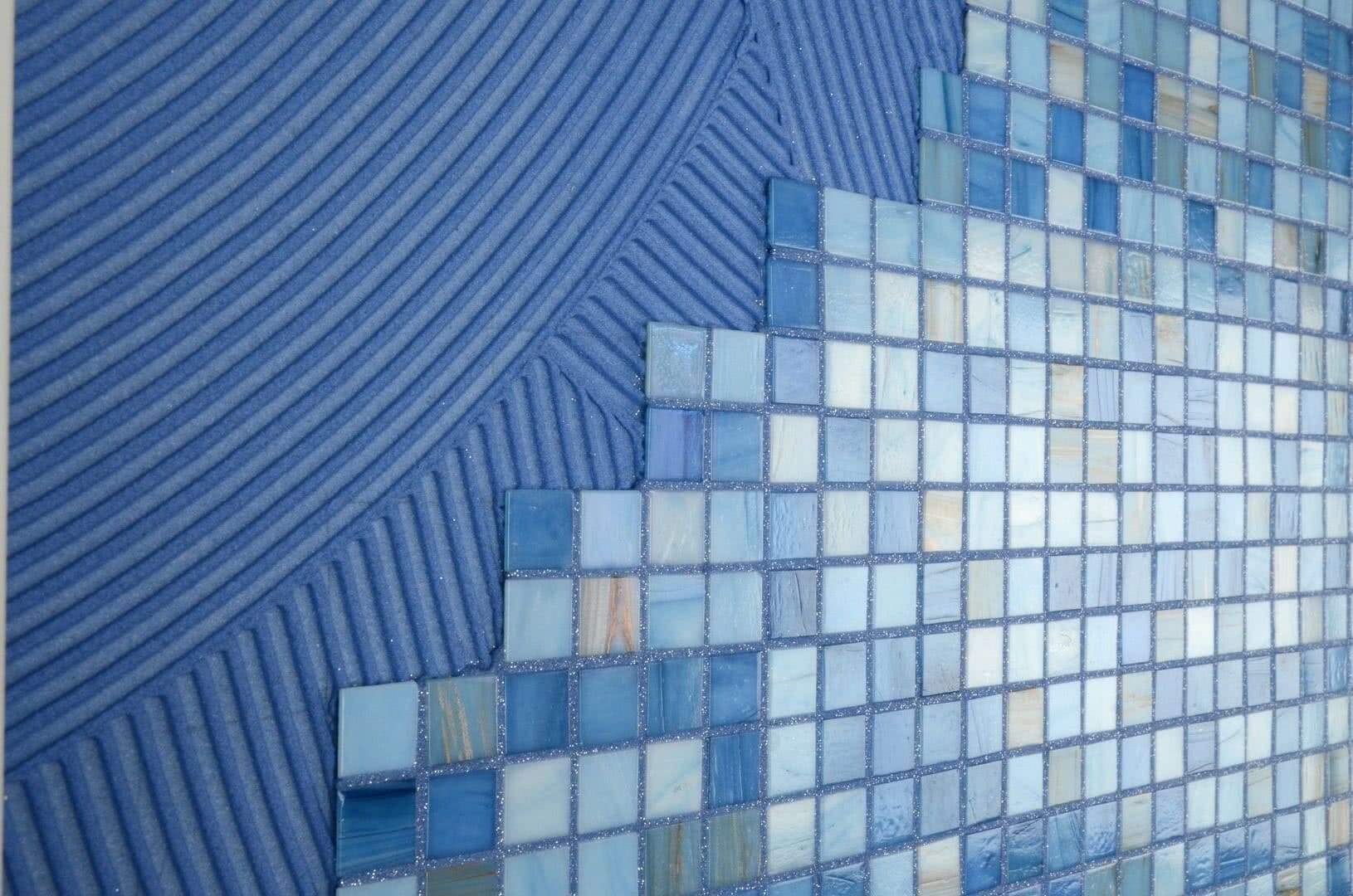 - Стеклянная мозаика просвечивает, поэтому для ее крепления лучше использовать прозрачный или белый состав. Серый цвет будет просвечивать через стекло и портить вид материала.