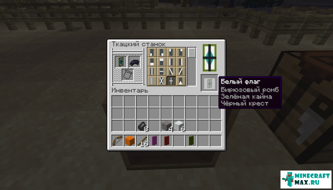 В схемах различных узоров очень важно расположение красителей, а нахождение в верстаке самого флага — не так критично. Чтобы отменить последние нанесенные узоры, флаг надо помыть в котле