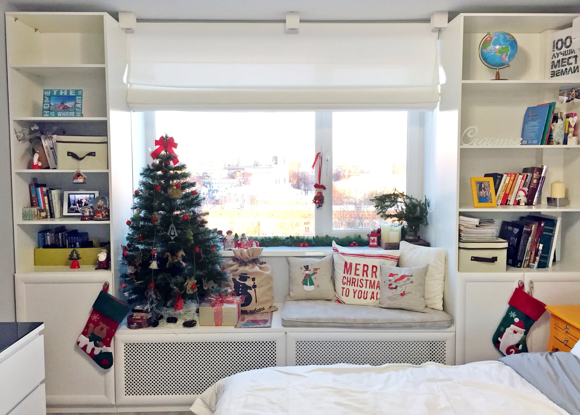 У Карины в ее светлой двушке на Площади Ильича подоконник в спальне возведен в ранг любимейшего места для отдыха и чтения. К Новому году она сменила подушки на тематические, и этот уголок смог поучаствовать в создании должной атмосферы к празднику!