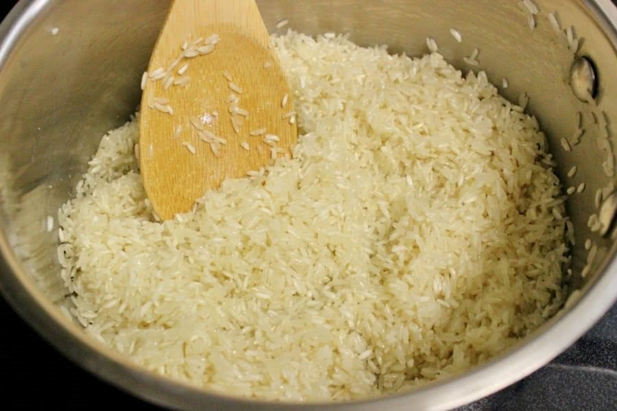 - После этого наливают кипяток и варят в нем рис до полуготовности.