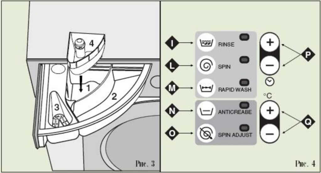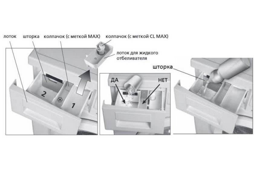 - отбеливатель и пятновыводитель заливают, как и обычный стиральный порошок, в отсек для основной стирки (В или II). Их дозировку производитель указывает на упаковке. При добавлении отбеливателя или пятновыводителя также рекомендуется установить дозатор для жидких моющих средств, если таковой есть в комплектации стиральной машинки;