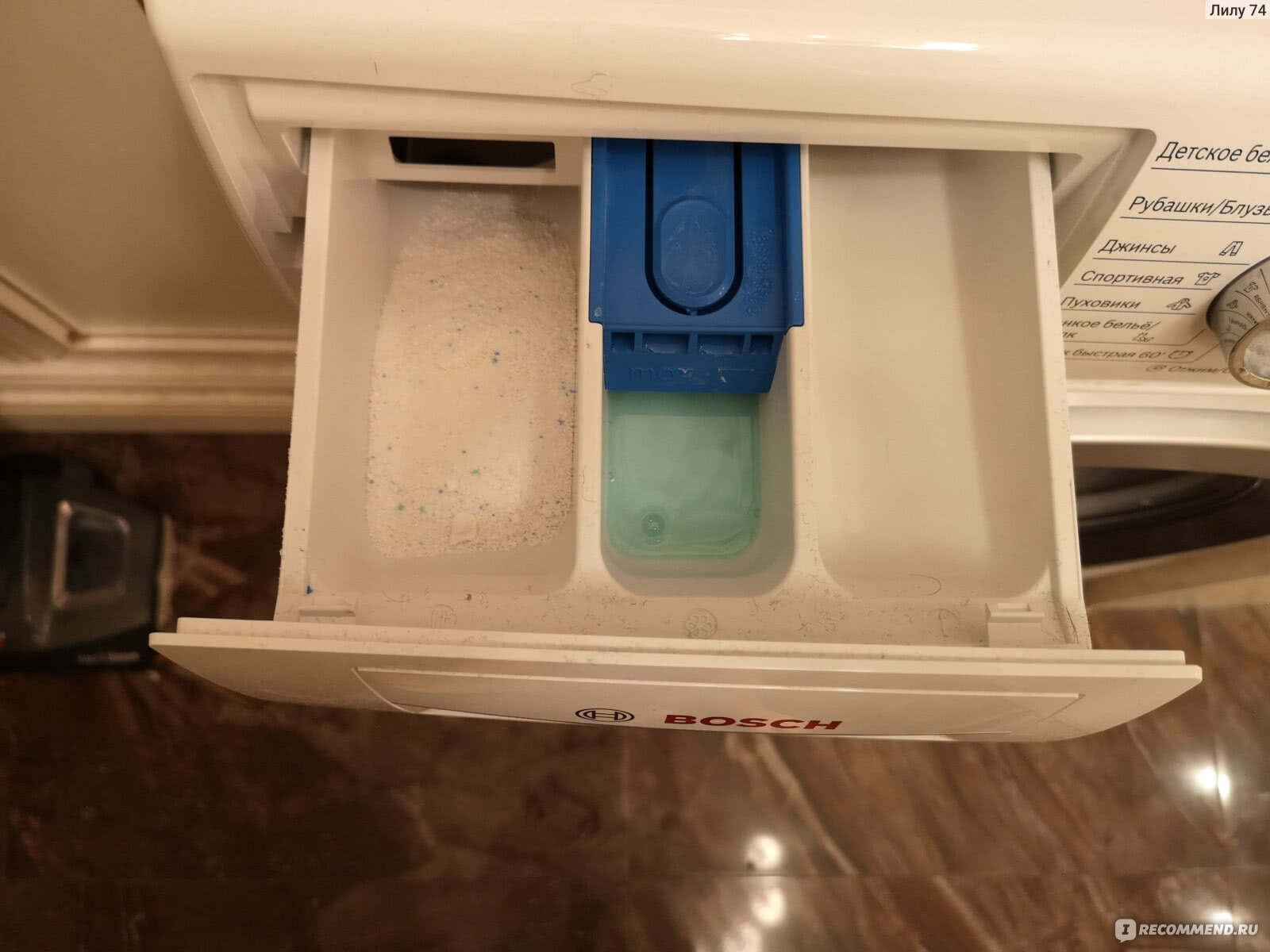 Стиральные машины Bosch оснащены емкостью для порошка с 4-мя отсеками. Первые три имеют стандартное предназначение, а четвертый используется для жидких моющих средств.
