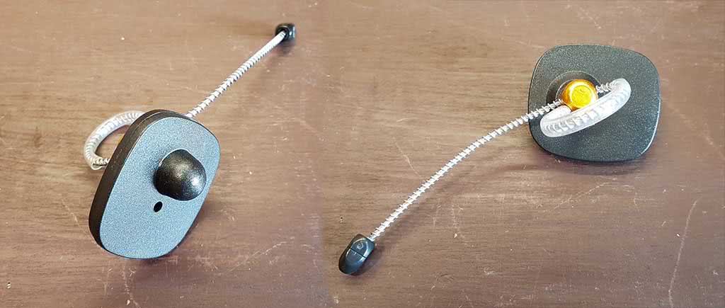 - Для обуви и аксессуаров применяют датчики с тросом, такая же защита используется на товарах класса «премиум».