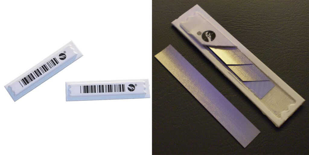 Это маленькие пластичные наклейки, что срабатывают даже при разрезанном виде. Такие наклейки крепятся на товары малых размеров.
