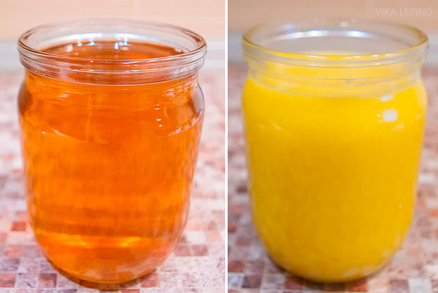 Еще одна причина, почему не затвердело масло гхи – приготовление под крышкой. В этом случае воде просто некуда деваться, она не испарится. В результате, продукт в банке будет расслаиваться на две фракции: более плотную внизу и более жидкую сверху.