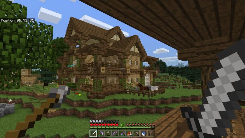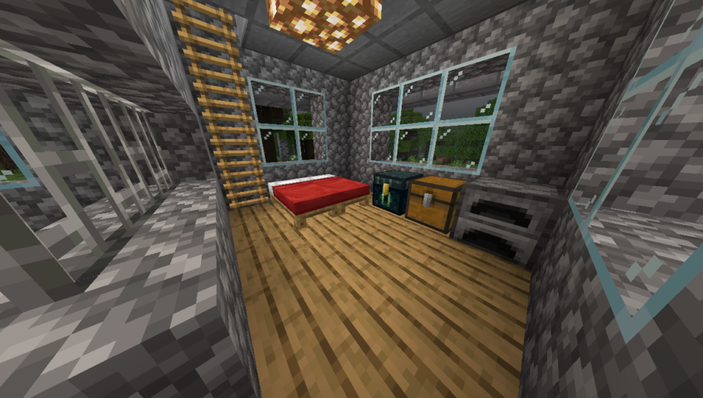 - Дома среднего уровня. Тот момент, когда игрок уже научился крафтить большинство красивых материалов и начал подключать фантазию во время строительства. Такие дома становятся привлекательными, состоят из нескольких блоков. К примеру, гостиная, кухня, отдельная веранда и башня с библиотекой. Появляются подвальные помещения, иногда создается фундамент. Используется немного декора и деталей.