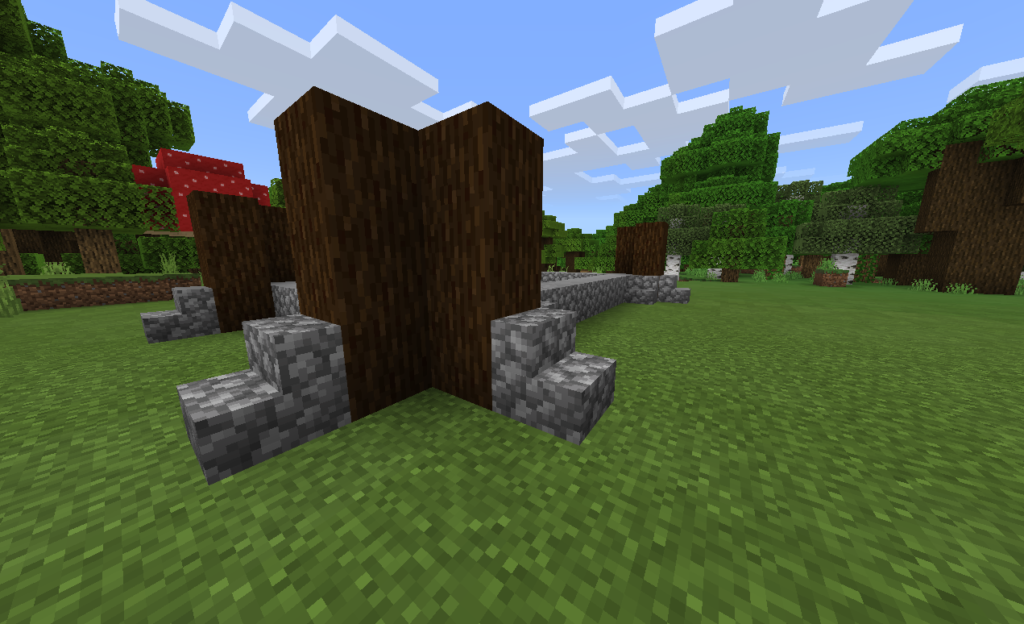 - После мы берем бревна. В нашем случае — это ель. Мы располагаем её по углам, так как показано на скриншоте и поднимаем на 5 блоков.