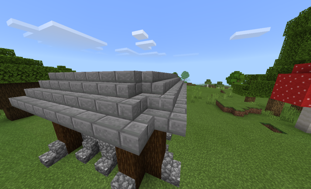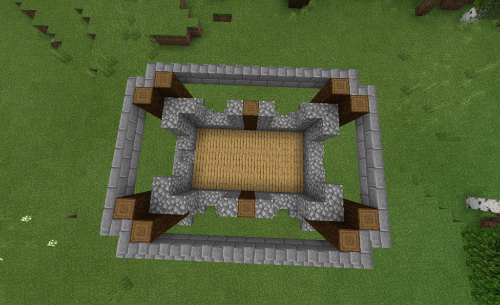 В процессе постройки мы добавили 2 деревянные балки, чтобы стена не выглядела слишком серо. Учитывайте это тоже и продумывайте, как будет выглядеть конечный результат постройки в Майнкрафте.