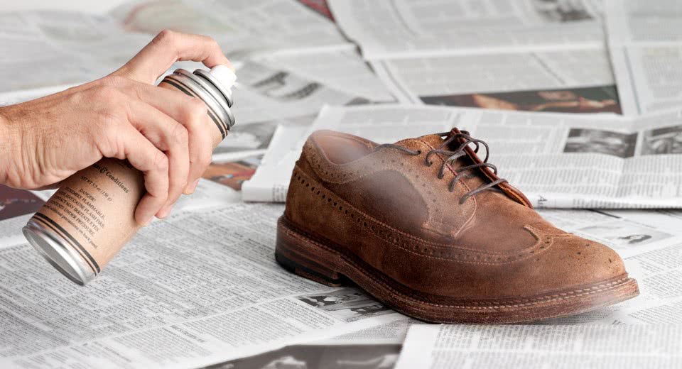 Одним из самых важных средств для первоначального ухода за ботиночками является водоотталкивающий спрей. Материал замша очень сильно подвержен негативному воздействию влаги и соли, поэтому на обуви могут образовывать белые разводы, которые значительно портят внешний вид вещи. После обработки пропиткой специальные наночастицы образуют невидимую защитную плёнку, благодаря чему обувь становится менее уязвима в непогоду.