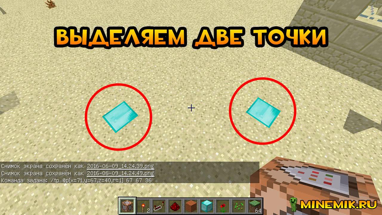 В инвентаре появился командный блок. Теперь мы должны найти две точки. 1 — откуда будем телепортироваться. 2 — куда будем телепортироваться. Я пометил эти позиции алмазными блоками.