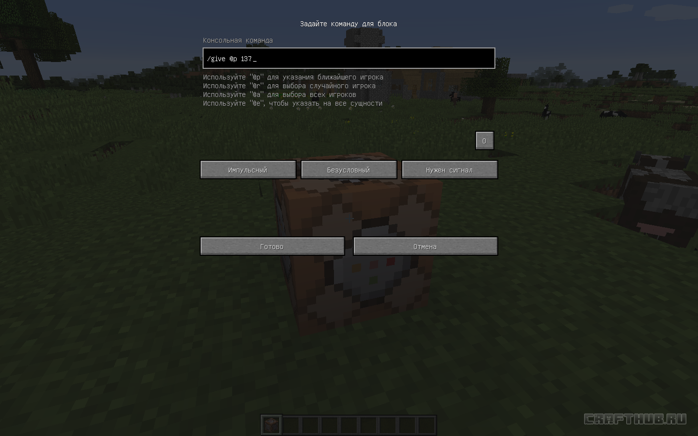 Итак, допустим, вы разобрались, как выдать себе командный блок,и он лежит у вас в инвентаре. Теперь давайте научимся им пользоваться.