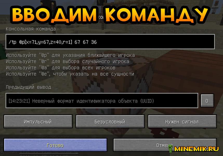 - Весь прикол в том, что писать команду может только ОП, нажать кнопку/рычаг и запустить команду может кто-угодно. Создавай/открывай мир, где командные блоки работают, ставишь блок, пишешь нужную команду, выходишь в главное меню и сворачиваешь игру, запускаешь редактор MCEdit, вырезаешь блок и вставляешь в нужном мире. Я уже делал таким образом телепорты, так шо гарантирую — работать будет. А если надо несколько команд, например шоб менять gamemode, погоду и прочее, строй в мире с читами командный дом — просто коробка из камня или из дерева, в её стены «вшиты» блоки, т.е. находятся внутри трёхслойной стены и активируются нажатием кнопки, над кнопкой табличка с названием команды. Могу скинуть тебе схему такой коробки для MCEdit’a (если надо пиши мне в обсуждении профиля), там есть 3 gamemod’a, изменение погоды на ясную, время суток на день\ночь, по-моему была настройка сложности и второй этаж, там можно поставить кровать. Блокпост ZLO (обсуждение) 09:20, 16 февраля 2014 (UTC)