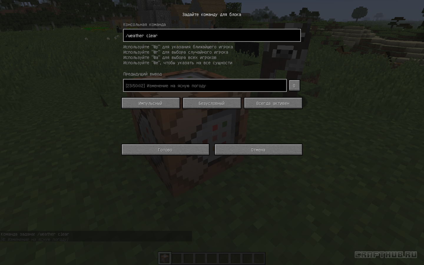 Когда вы вводите команду в блок, нужно указать, на какого игрока она направлена. Это можно сделать вводом имени игрока или выбором трёх разных переменных: «@p» (ближайший игрок), «@r» (случайный игрок) или «@a» (все игроки). Эти переменные особенно полезны в ситуациях, когда неизвестен игрок, активирующий команду. Задав команду, нажмите «Готово» для её сохранения.