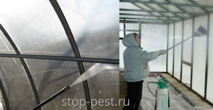 Во время обработки каркаса можно сразу дезинфицировать поликарбантное покрытие. При чем обрабатывать теплицу нужно с обоих сторон. Для дезинфекции сначала промываем теплицу мыльным раствором мягкой губкой, чтобы не повредить теплицу. Затем применяем химические или биалогические препараты для уничтожения вредителей и болезней.