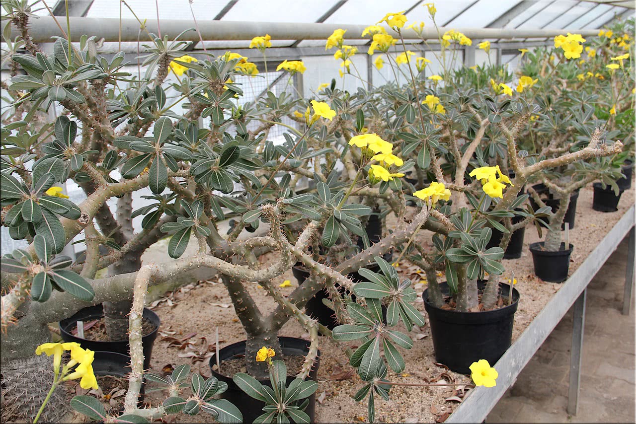 Пахиподиум густоцветковый (Pachypodium densiflorum). Родина – засушливые раоны о. Мадагаскар. Ствол мясистый, серо-зеленый, до 30 см в диаметре. В горшечной культуре достигает 90 см в высоту. Листья располагаются в верхушечной части ствола. Цветет ярко-желтыми цветами. Растет медленно, и способно цвести, когда растение достигнет 30 см в диаметре. В зимний период из-за недостатка света может сбрасывать листья.