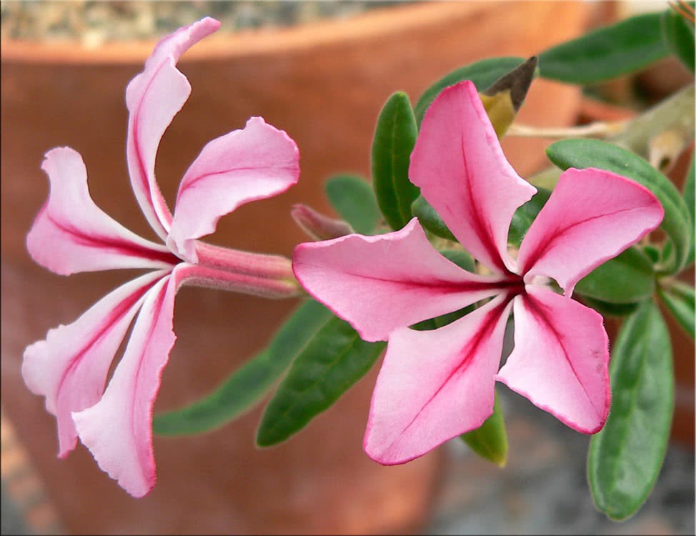 Цветы у пахиподиума ламера бело-кремовые, с нежным розоватым оттенком и желтым зевом.