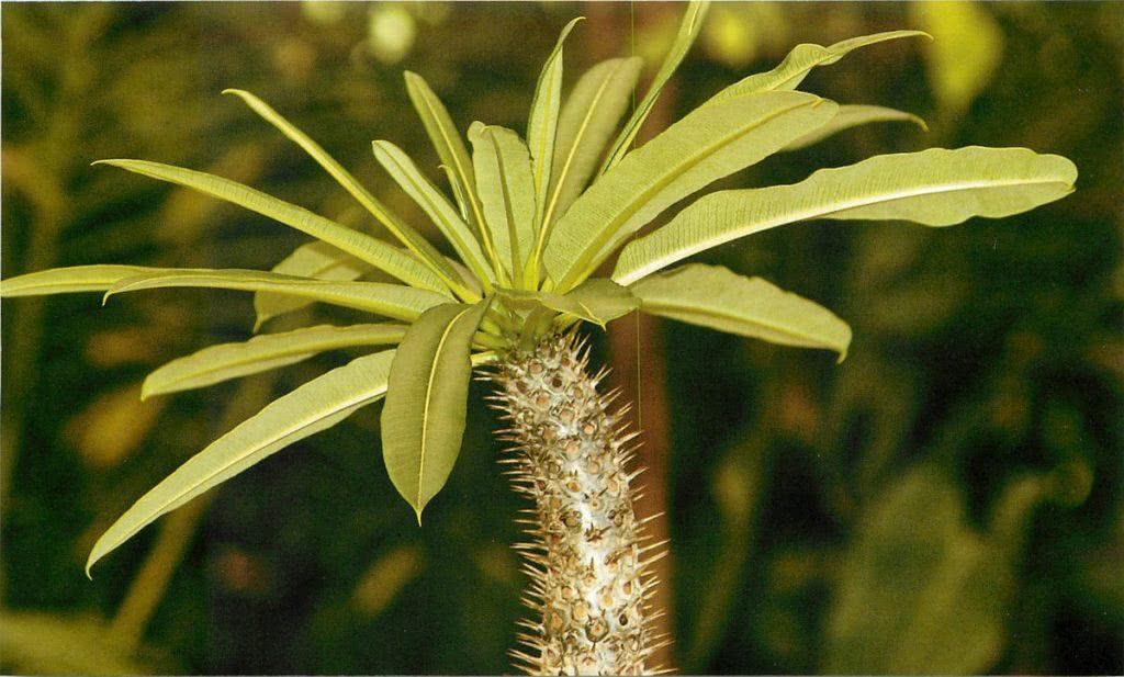 Вот именно этот вид именуют часто «мадагаскарской пальмой». Растение обладает очень пышной кроной за счет большого количества длинных листьев(до 0,4 м). Стволовая часть толстая, с многочисленными бугорками. По стволу располагается много толстых иголок-колючек.