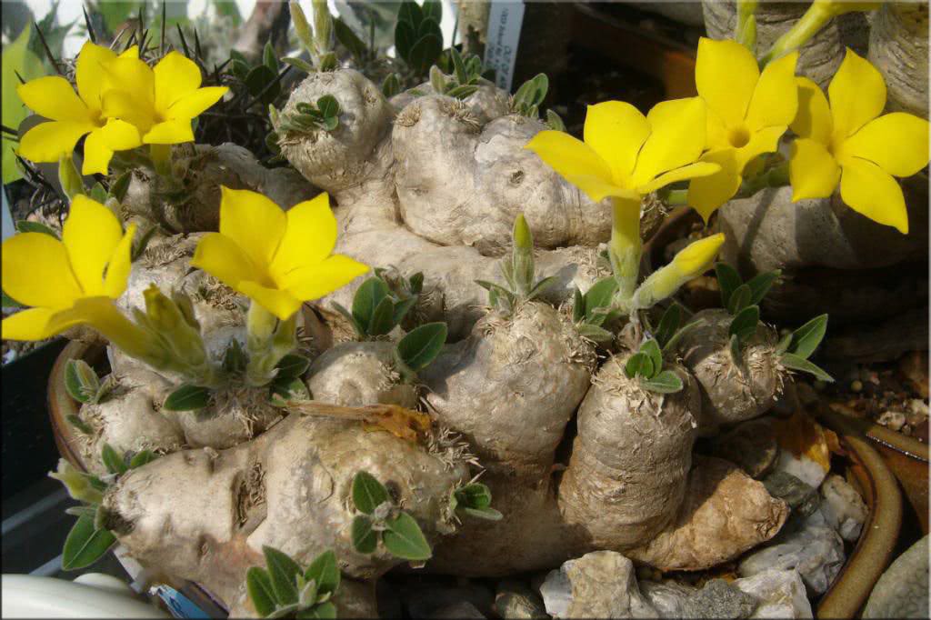 Еще будучи молодым растеньицем, пахиподиум хоромбензе интенсивно ветвится, причем его веточки нередко растут из нижнего утолщения ствола. Цветет он весьма эффектно, у него большие цветы желтой окраски, образующие кистеобразные соцветия. При посадке семян пахиподиума данной разновидности ждать периода цветения можно через 24–48 месяцев.