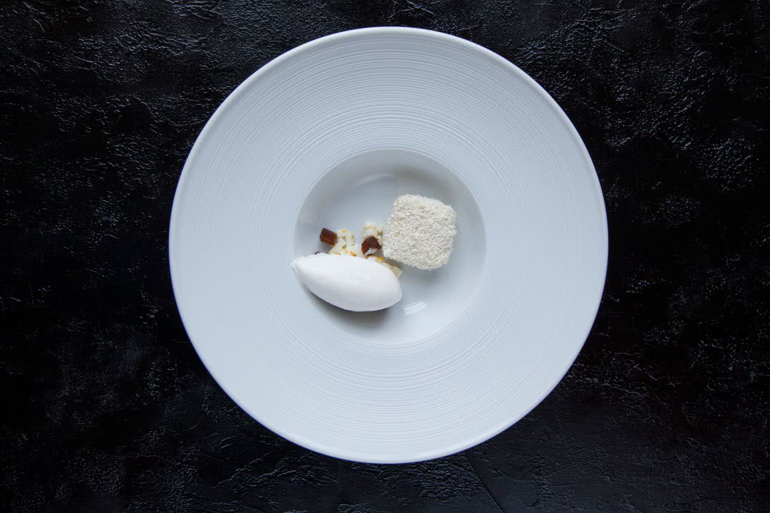 1. Приготовить мороженое. Для этого смешать все ингредиенты и измельчить в блендере до однородной и гладкой текстуры. Приготовить мороженое удобным для вас способом (например, с помощью мороженицы). 2. Приготовить сироп. Карамелизовать сахар до светло коричневого цвета, налить воду и добавить пастернак. Варить сироп до температуры 103С. Процедить. 3. Приготовить тартар из кокоса. Нарезать кокос кубиками 2х2 мм. Добавить мелко порезанную цедру апельсина и лайма. Добавить сок цитрусовых и заваккумировать. Мариновать час. Отделить сок, подсушить кокос. 4. Приготовить желе из пастернака. В теплом молоке растворить подготовленный желатин. Соединить все ингредиенты и измельчить в блендере до однородной и гладкой текстуры. Залить в квадратную силиконовую форму. Заморозить. Растопить белый шоколад. Окунуться в него замороженый кубик, затем обвалять в кокосовой стружке. Убрать заготовку в холодильник на 4 часа. 5. Подготовить пастернак в квасе. Выпарить квас до состояния сиропа. Обжарить запеченный пастернак нарезанный кубиками 0.5 см. Добавить квас. 6. Сервировать блюдо. На тарелку выложить тартар из кокоса, поверх него – пастернак карамелизированный в квасе. Затем желе из пастернака в шоколаде. Сверху положить мороженое.