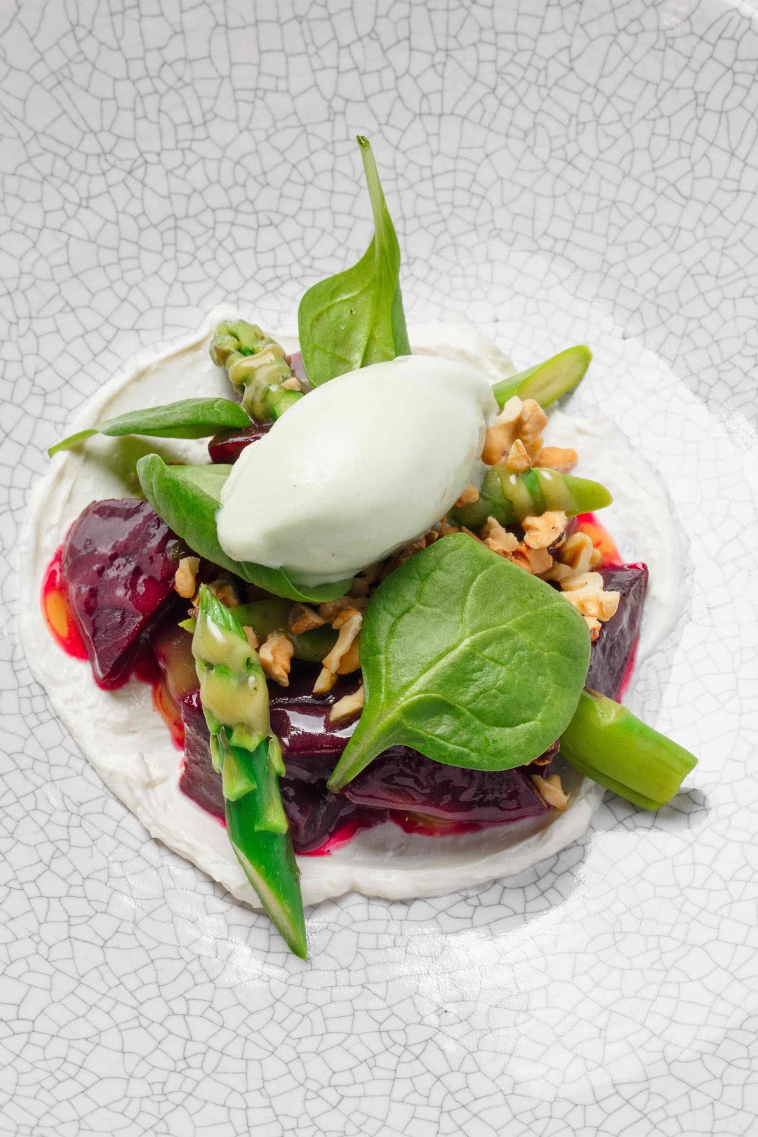 Отварная свекла – 300 г Кленовый сироп – 100 г Сливочное масло – 50 г Сыр фета – 150 г Сливки 33% – 50 мл Микс салатных листьев – 50 г (шпинат, корн, руккола) Обжаренные грецкие орехи – 50 г Съедобные цветы – 20-25 шт Сливочное мороженое – по вкусу Порошок васаби – по вкусу