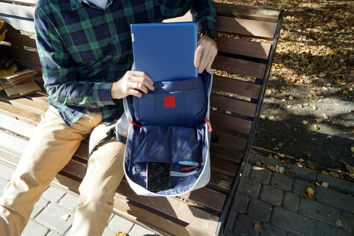 Внутренний отсек разделён на несколько секций для лэптопа, планшета. Остальной объём занимает пустое пространство, куда спокойно помещается несколько личных вещей.