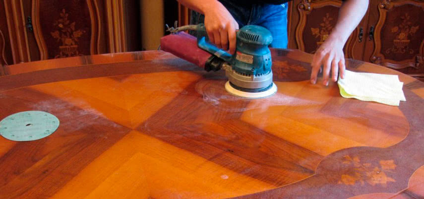 Шкаф или трельяж разбирают и снимают с него все скрепления, потому что полироль необходимо наносить только в горизонтальном положении. Поэтому мастерам не сложно будет понять, как отполировать стол. Далее они заделывают все глубокие трещины специальной шпаклевкой. Для шлифовки используют УШМ и несколько видов наждачной бумаги.