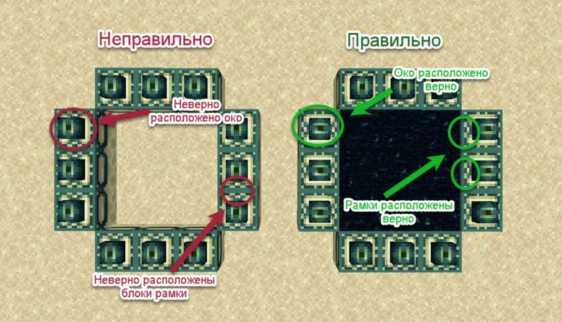 , нужно его активировать. Активатором выступает око Края. Их нужно двенадцать штук, по числу рамок. Каждое око нужно установить в рамочный блок. «Окно» в Край своими силами сделать нельзя, в Майнкрафт его можно только найти. Искать следует в крепости. Там, в особой комнате, над лавой, и находится портал. Некоторые рамки иногда уже имеют око Края, но даже в этом случае их количество — максимум два. Остальные придётся самим добывать. После заполнения всех рамок внутри возникают девять блоков, непосредственно, портала. Вся эта схема может не сработать, если помещение, в котором находится портал, каким-то образом пересекается с, например, заброшенными шахтами или любыми другими подобными (естественными) структурами. Тогда придётся отправляться на поиски другой крепости.
