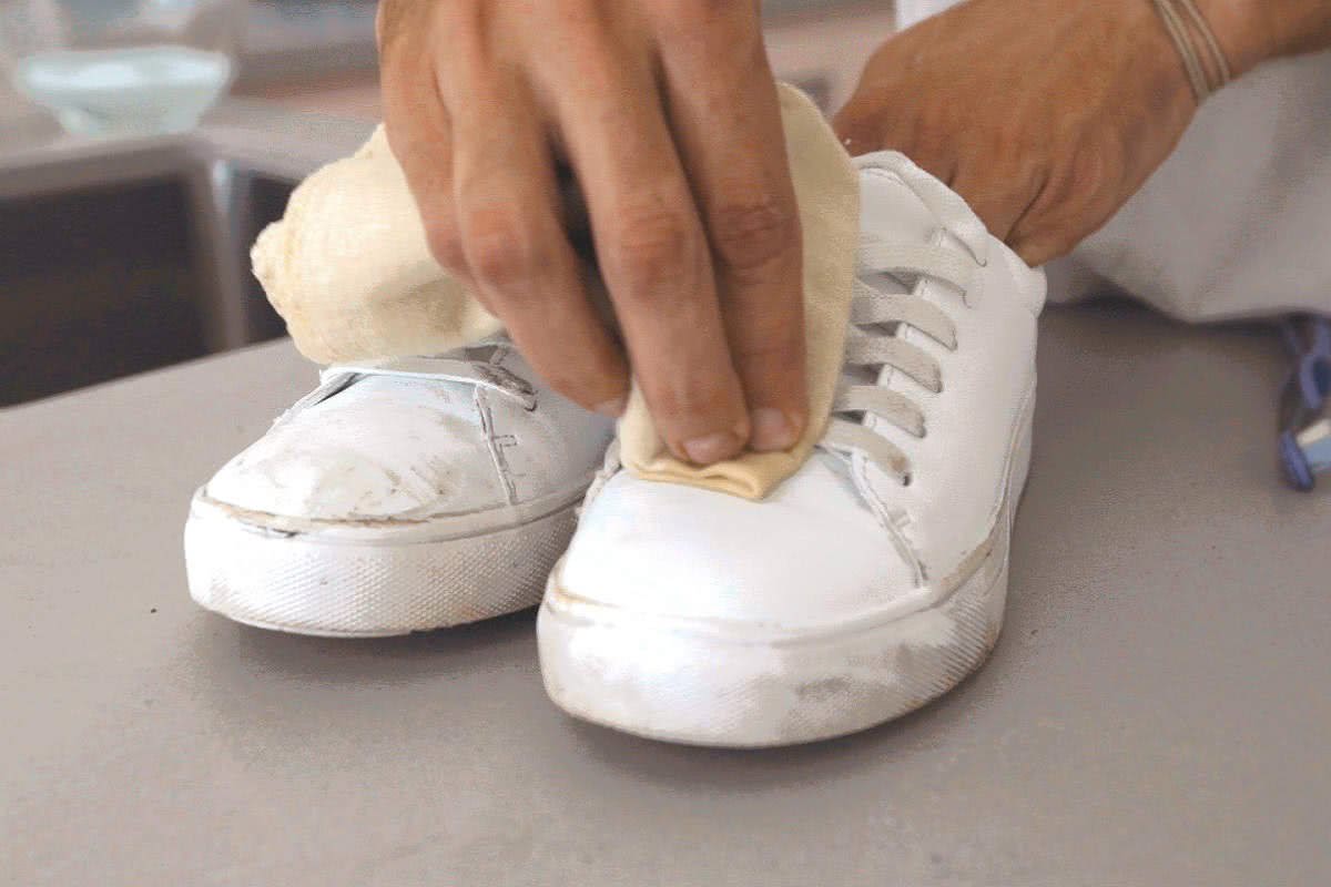 Для белых кожаных кроссовок хорошо подойдёт паста из картофельного крахмала, разбавленного молоком в соотношении 1 : 1. Густо намажьте этой пастой поверхность, а затем сотрите салфеткой, смоченной в тёплой воде.