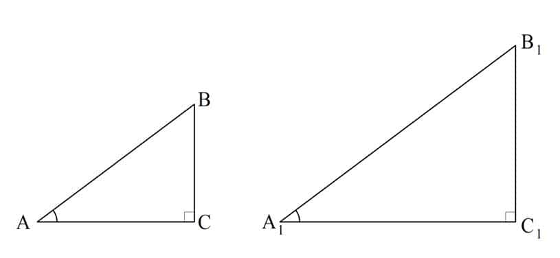 Принципиально важно то, что если в двух прямоугольных треугольниках острые углы одинаковы, то и значение их синусов, косинусов и тангенсов также будут одинаковы. Действительно, пусть у ∆АBС и ∆А1В1С1 одинаковы∠А и ∠А1, а ∠С и ∠С1 – прямые: