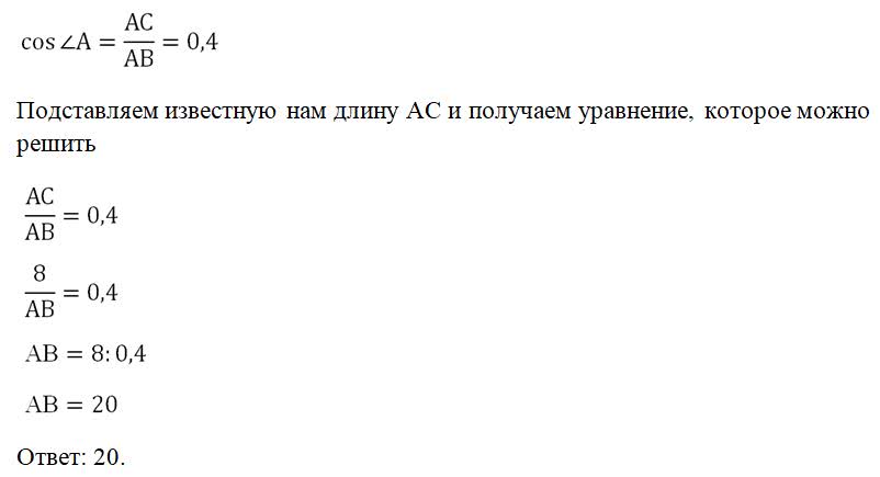 Задание. В прямоугольном ∆АBС АС = 8, cos∠A = 0,4. Какова длина гипотенузы АB?