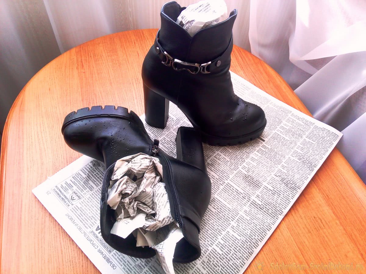 Заранее набейте обувь бумагой. Средства наносите сверху сапог.