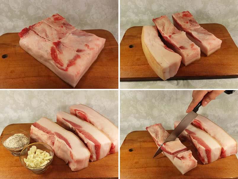 Я солю сало с мясной прослойкой, можно таким способом посолить и сало без прослоек. На рынке необходимо тщательно подойти к выбору хорошего кусочка сала для засолки. Если есть возможность, попросите продавца отрезать небольшой кусочек шкуры. Подпалите ее с помощью зажигалки (на это уйдёт пара секунд), а затем хорошо понюхайте. Таким образом вам откроется весь запах, легко будет обнаружить, как в народе говорят «кнурятину», — сало не кастрированного кабана. Мясо и сало у таких животных воняет даже при термической обработке. Также необходимо смотреть и на само сало — оно должно быть светлое, не липкое. Шкура должна быть без щетины, хорошо осмолена. В селах смолят соломой, тогда и сало имеет фантастический аромат копченостей.