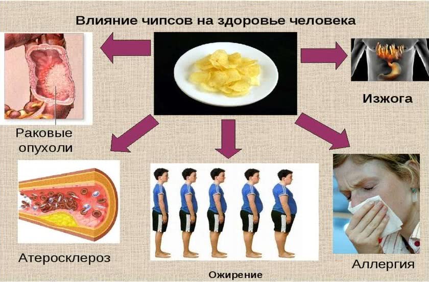 Указанные продукты имеют в составе значительный объем стабилизаторов и ароматизаторов (их еще называют усилителями вкуса). Поэтому от чипсов и картофеля-фри буквально невозможно оторваться, начав есть. Но мы редко задумываемся, чтокартошка «Фри» в точках так называемого быстрого питания проходит термическую обработку в многократно отработанном растительном масле, что провоцирует выделение канцерогенов. Кроме того, технология изготовления чипсов такова, что приводит к формированию канцерогенных синтетических жиров и прочих «возбудителей» раковых заболеваний. Вероятные осложнения: Злокачественные новообразования (уже упомянутые канцерогены в составе), так называемый «синдром китайского ресторана» (для него характерны головная боль, покраснение лица, потоотделение и проч.). Прочие недуги, которые можно «приобрести», увлекаясь чипсами и картофелем – фри, еще даже не названы.