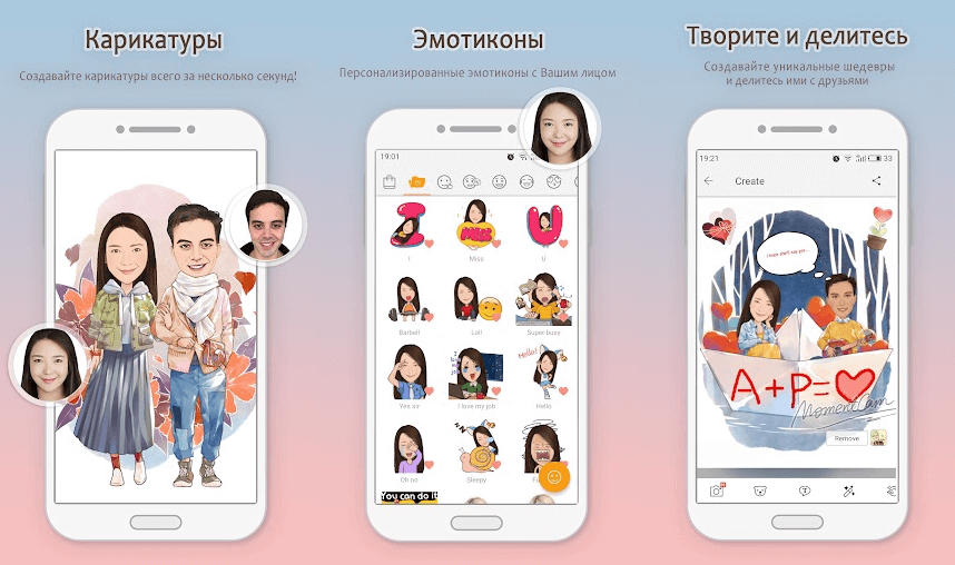 MomentCam Cartoons придется по вкусу активным пользователям социальных сетей. С его помощью можно создавать карикатуры из фотографий, а затем устанавливать в качестве аватарок на своих страницах. Кроме того, вы сможете делать анимированные смайлики и делиться ими с друзьями. Коллекции фонов и фильтров пополняются ежедневно, что дает огромный простор для полета фантазии.