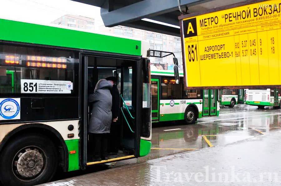 Добраться к нужному терминалу аэропорта таким образом можно с двух станций метро. Если вы добрались до станции Замоскворецкой зеленой линии «Речной вокзал», то можете выйти из метро в сторону от последнего вагона поезда и попасть на остановку «Экспрессов» №№ 851 и 851С. Эти маршруты идут до Шереметьево-1 и Шереметьево-2, чтобы попасть в аэропорт потребуется 40-50 мин.